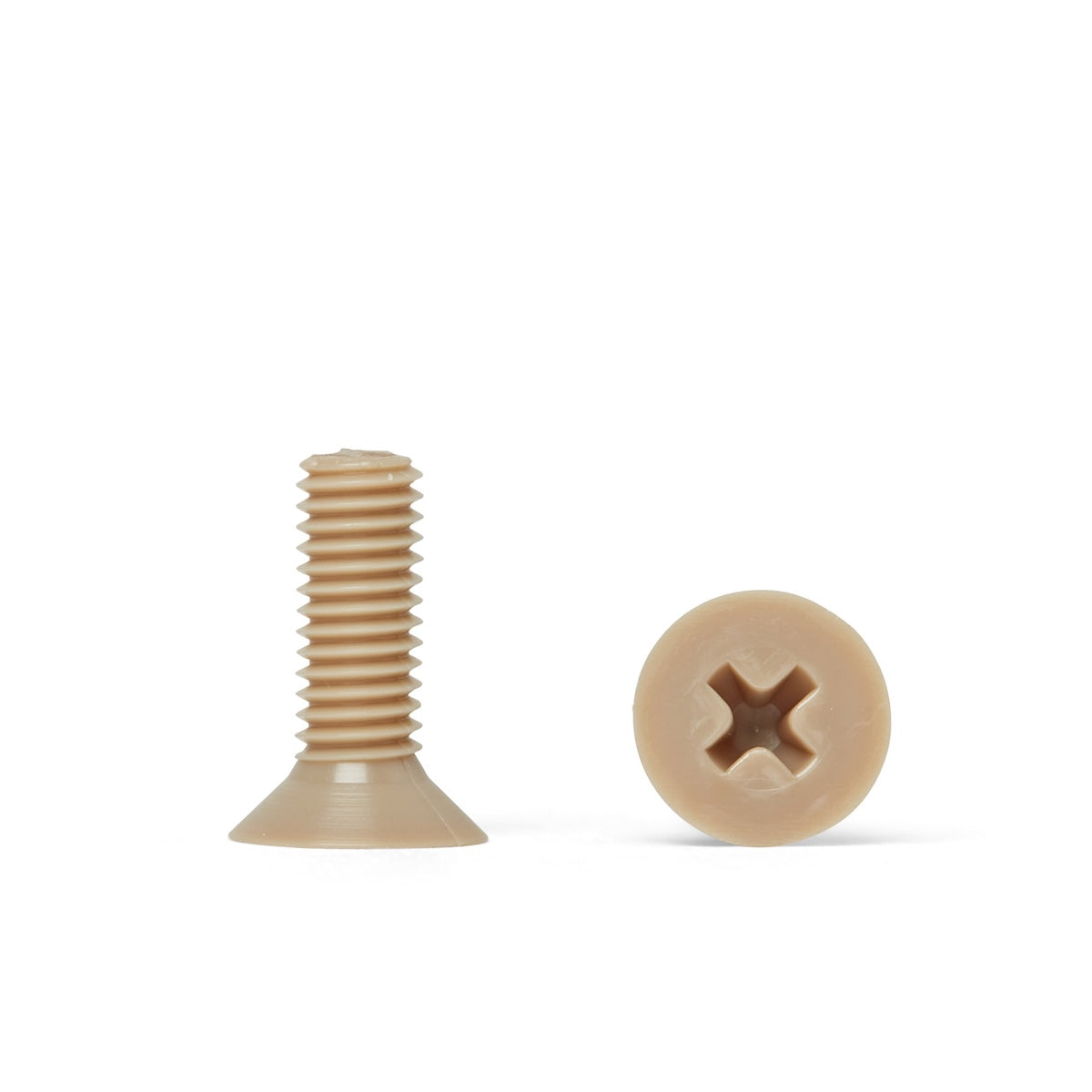PEEK (polyetheretherketone) countersunk screws are screws with a conical head that is flush with the surface of the material into which it is installed. They are made of PEEK, a type of plastic that is known for its high strength and durability. PEEK is a semi-crystalline, high-temperature plastic that is resistant to chemical and mechanical wear, as well as high temperatures.