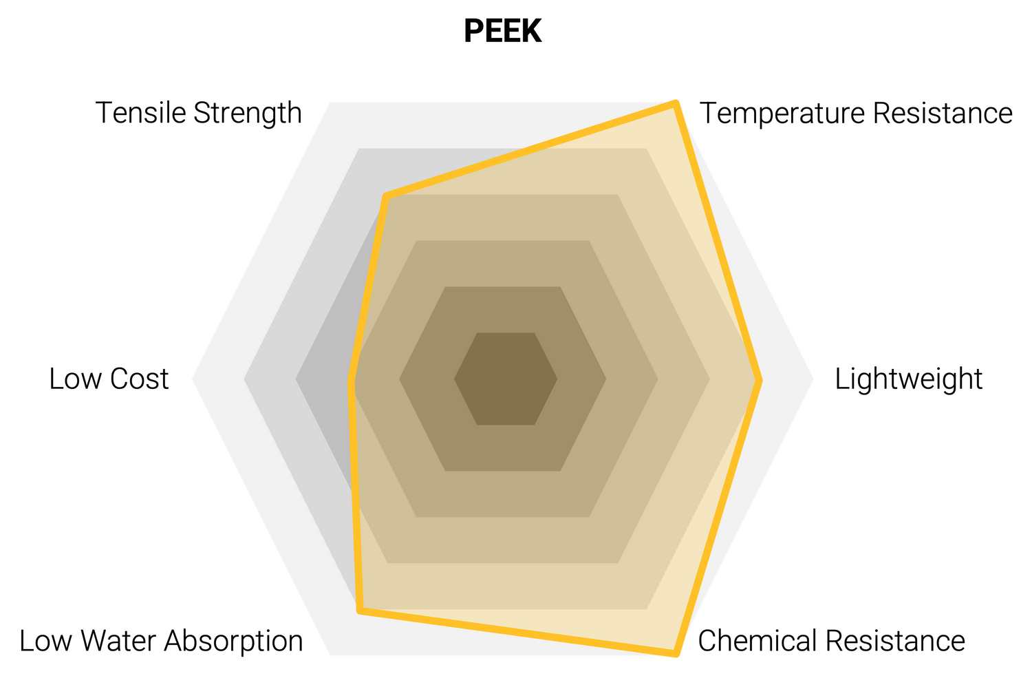 • Exceptional chemical resistance - PEEK can only be dissolved in high concentrations of Nitric and Sulphuric acids.