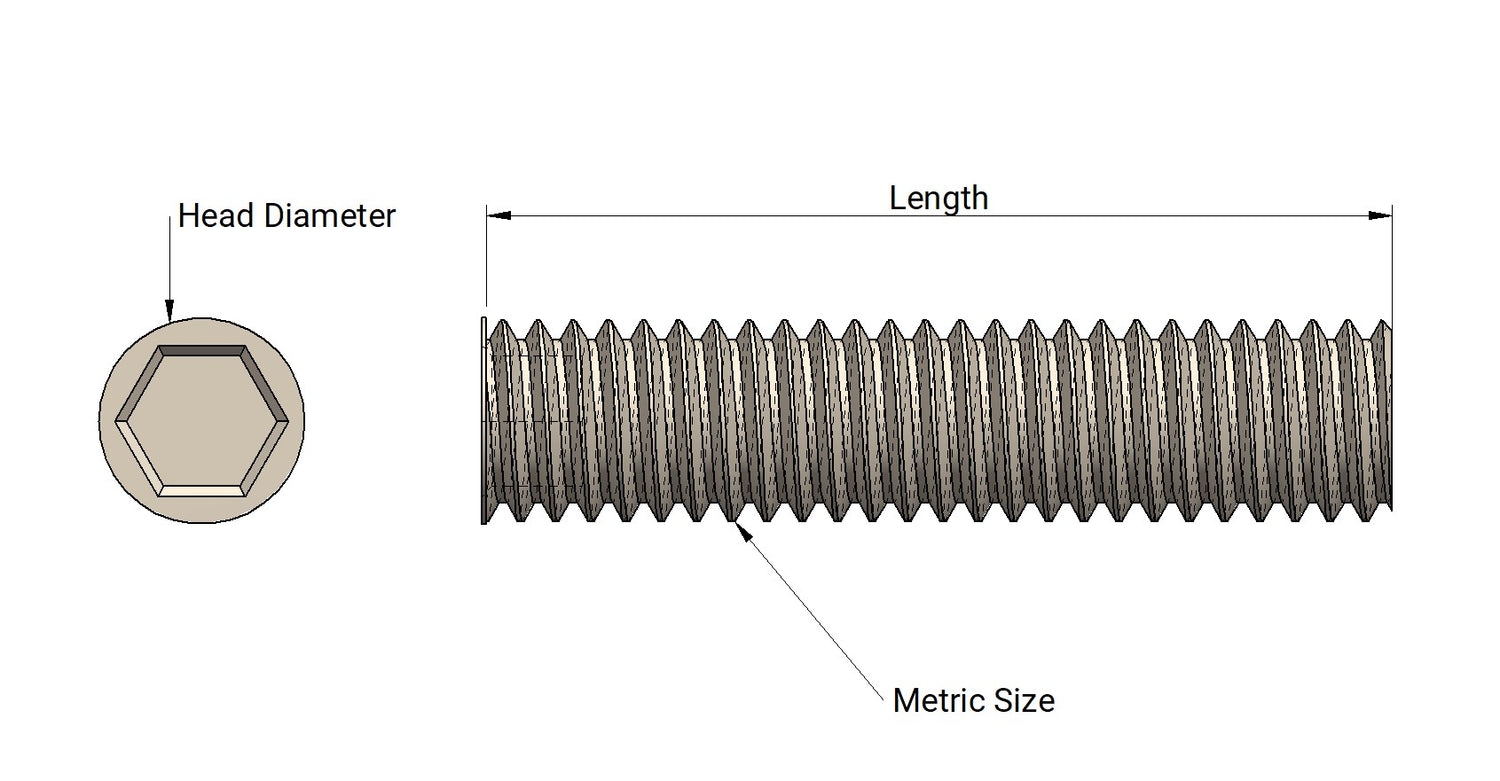 HPP stock grub/set screws that feature a hexagonal drive-type for use with a hex key (sizes are given in the dimensions table above).