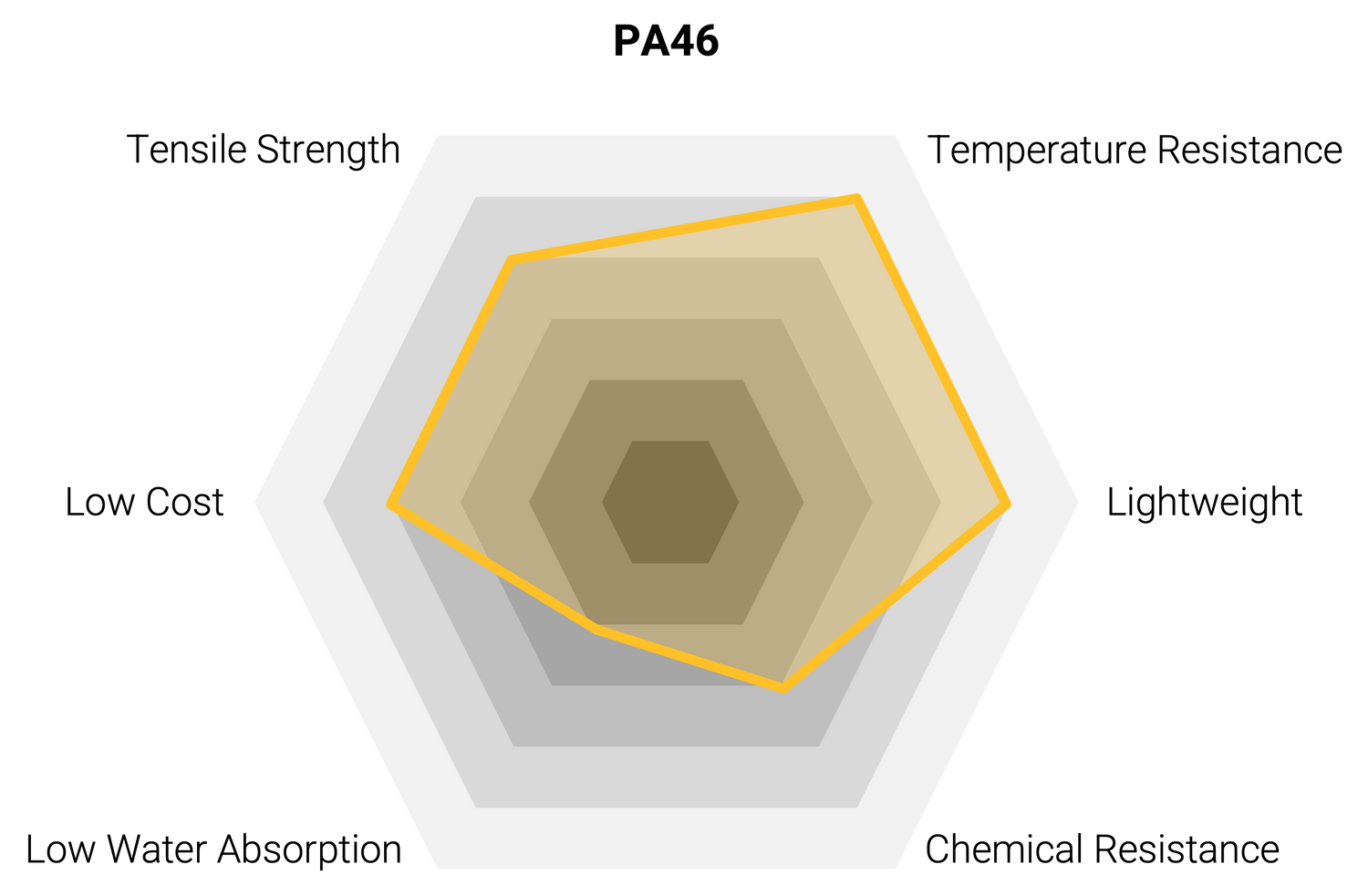 • Polyamide Nylon (PA46) is renowned for its exceptional high-temperature performance, making it an ideal material for applications that require stability and durability under extreme heat. PA46 has a higher melting point compared to other polyamides, allowing it to maintain its mechanical properties and dimensional stability at temperatures exceeding 150°C. This makes PA46 particularly suitable for use in automotive and industrial applications, such as engine components, transmission systems, and electrical insulators, where materials are regularly exposed to high temperatures.