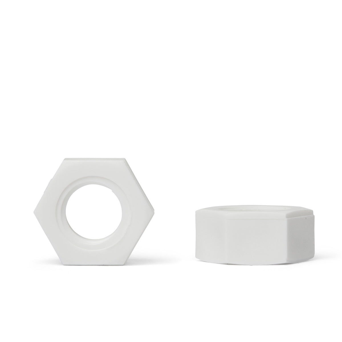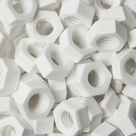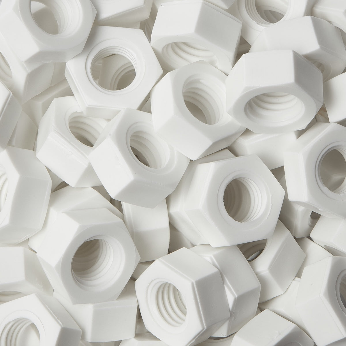 Polypropylene (PP) Hexagon Nuts are a great general use polymer nut and are commonly utilised in a wide range of applications. PP is one of the lightest materials we provide with a specific gravity of 0.9. This paired with excellent chemical and hydrolysis resistance and electrical insulation makes PP a great fastener for general use applications.